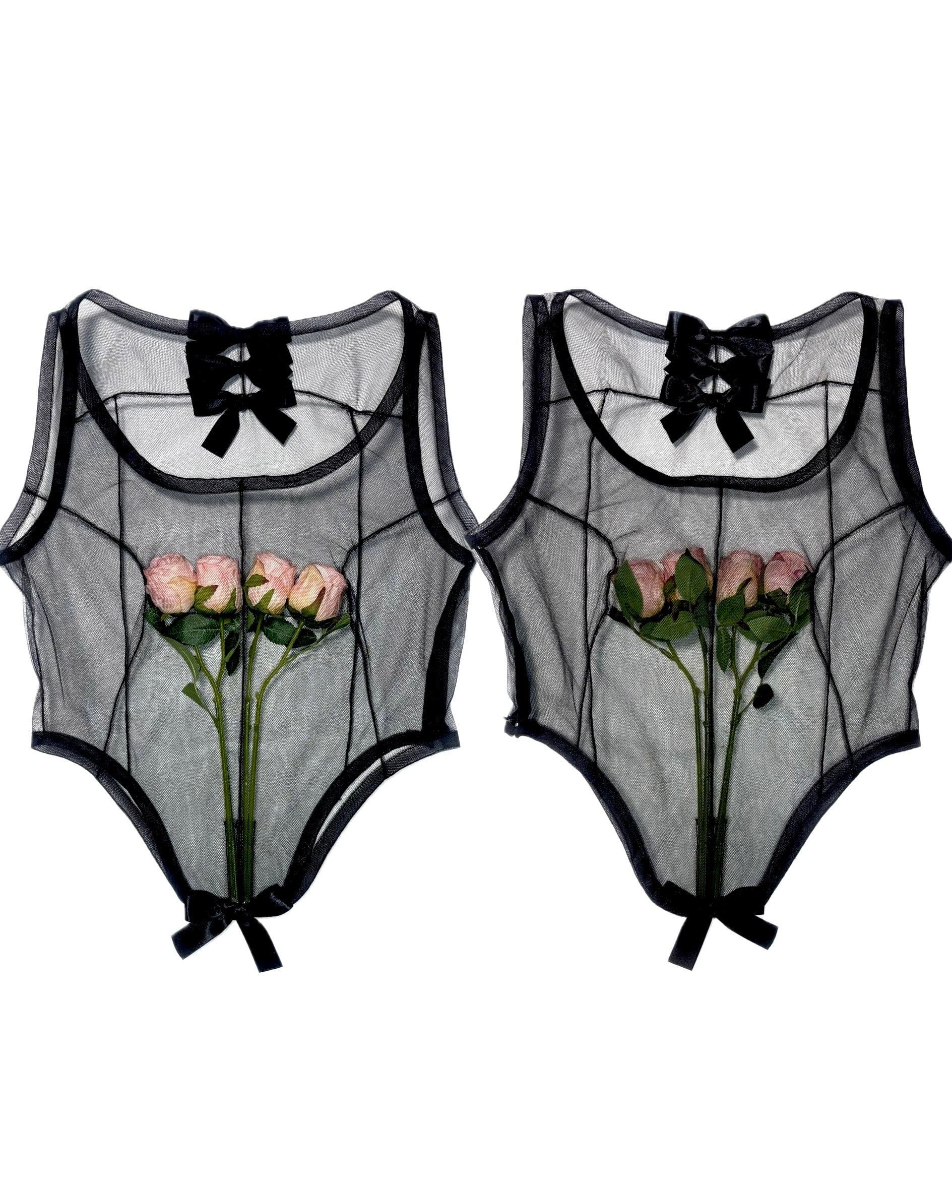 シアーな素材に薔薇を窒息閉じ込めたロマンティックなトップス。