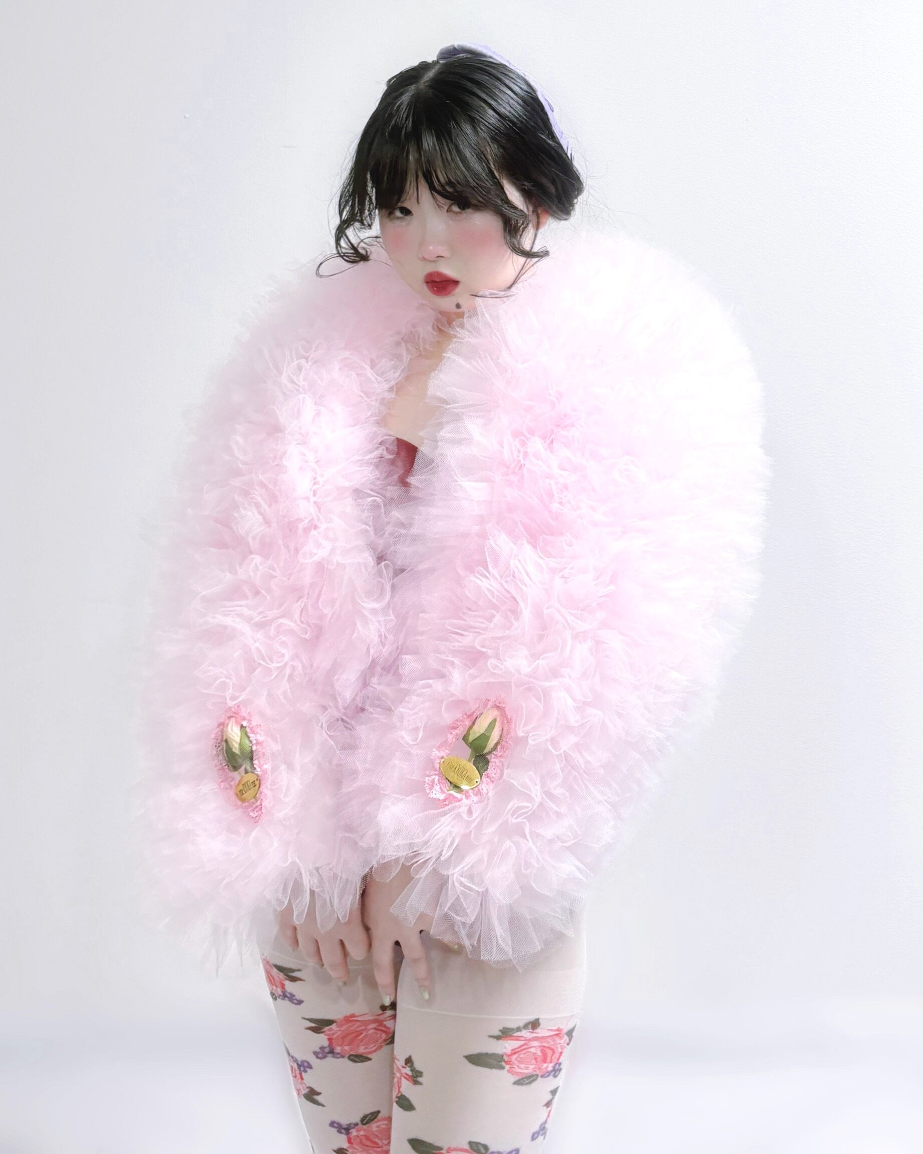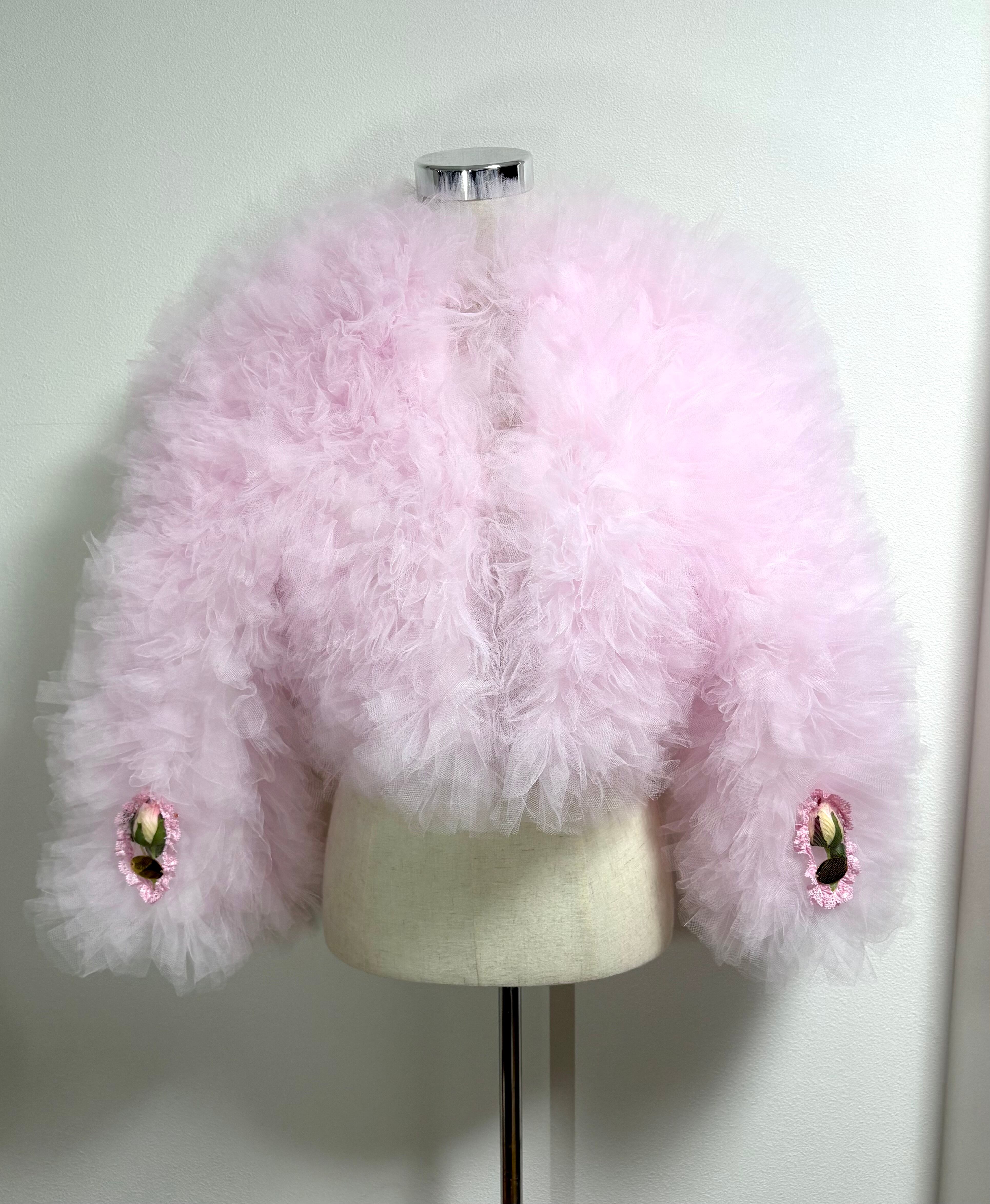 甘い甘いピンクカラーのチュールフリルをファーコートのように仕上げた2025年のrose KYOKA roseのコート。