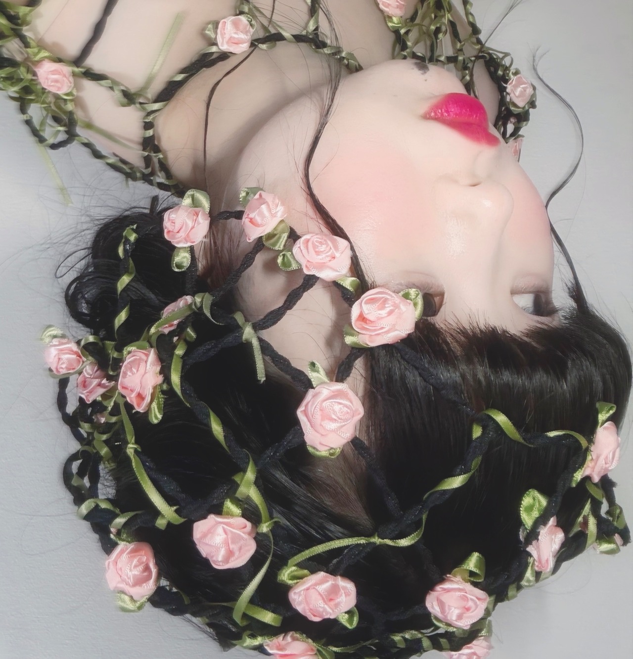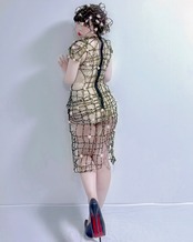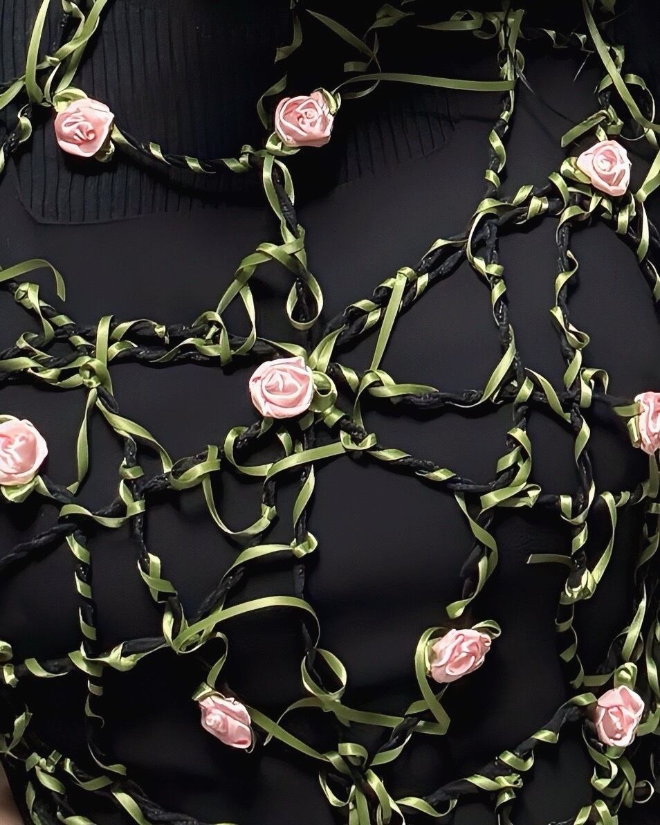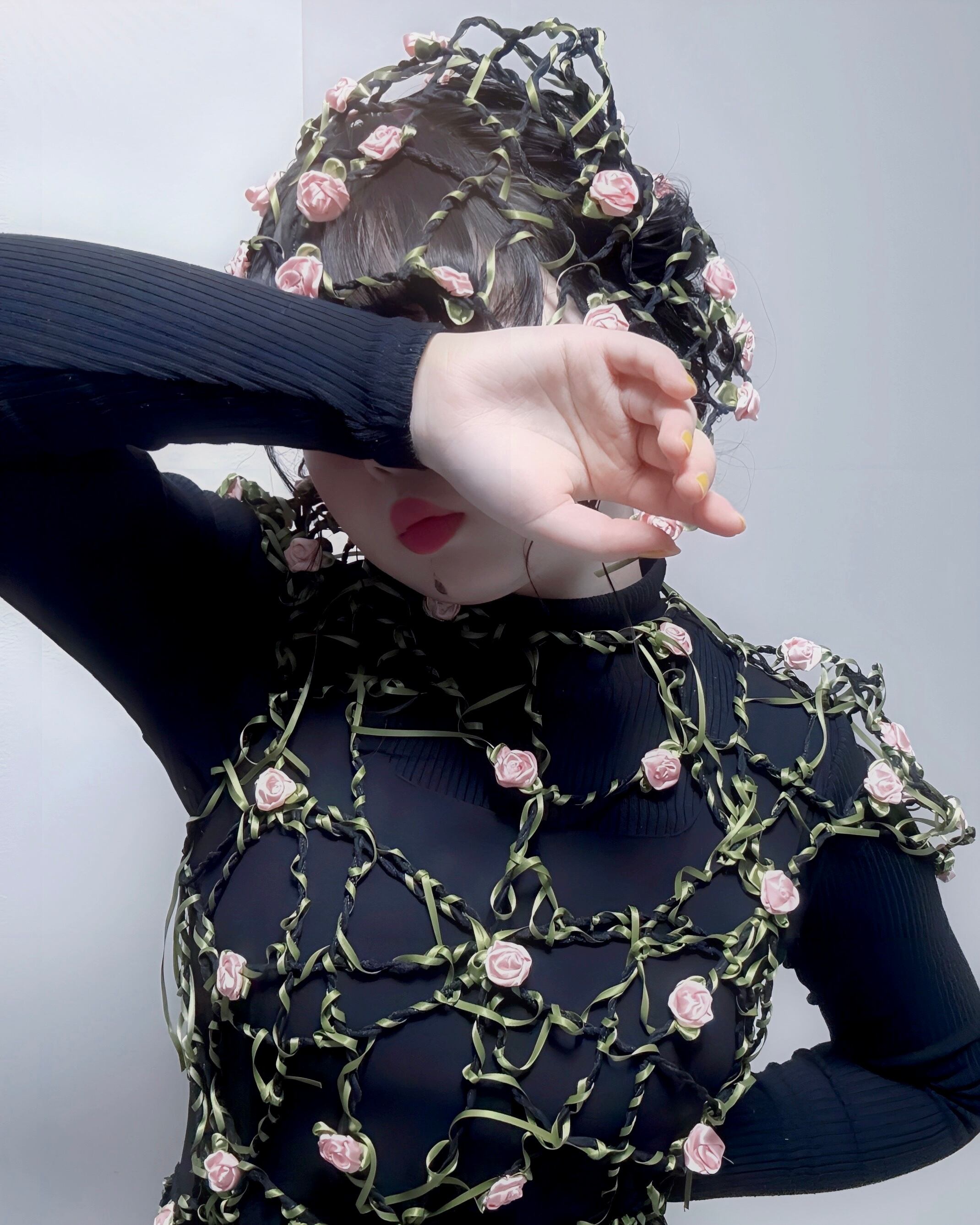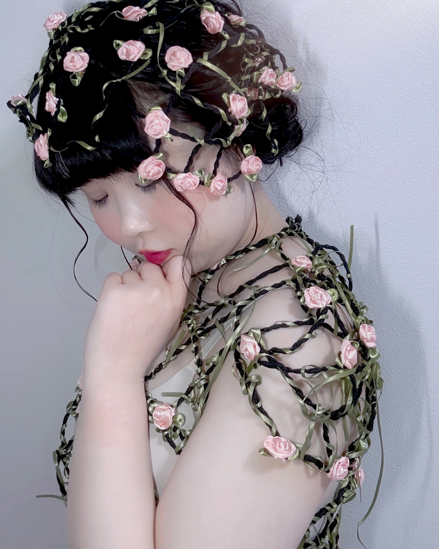 魔女の庭にある大きな薔薇のアーチをドレスにしました。立体的で体に沿ったタイト型のドレスに無造作に薔薇が咲いています。