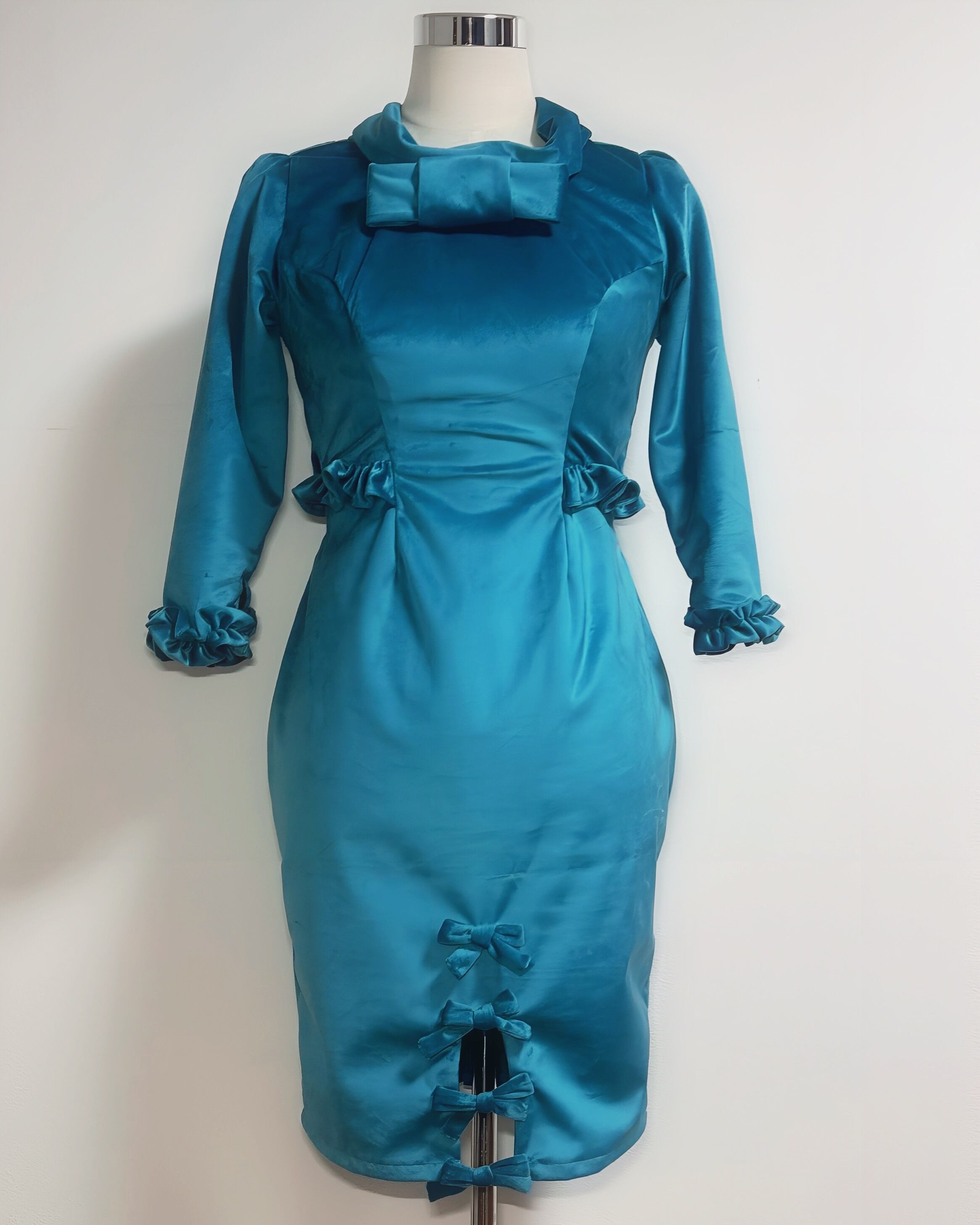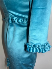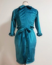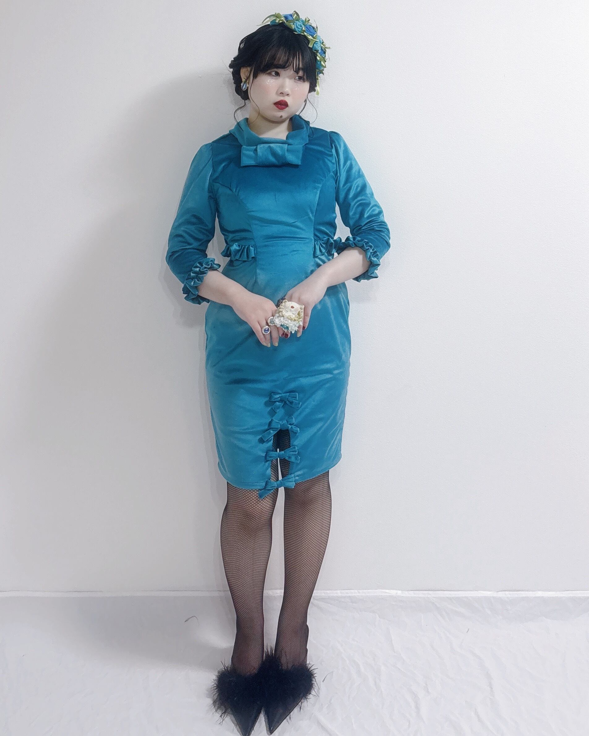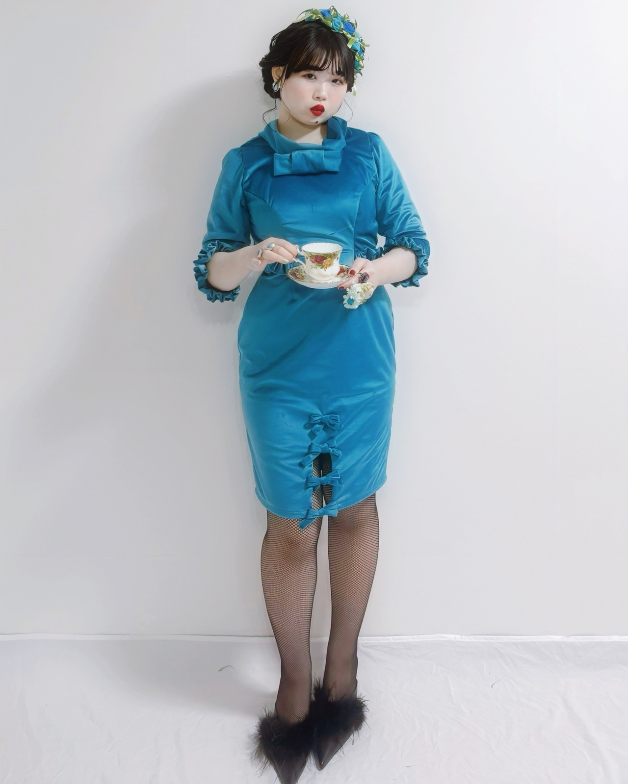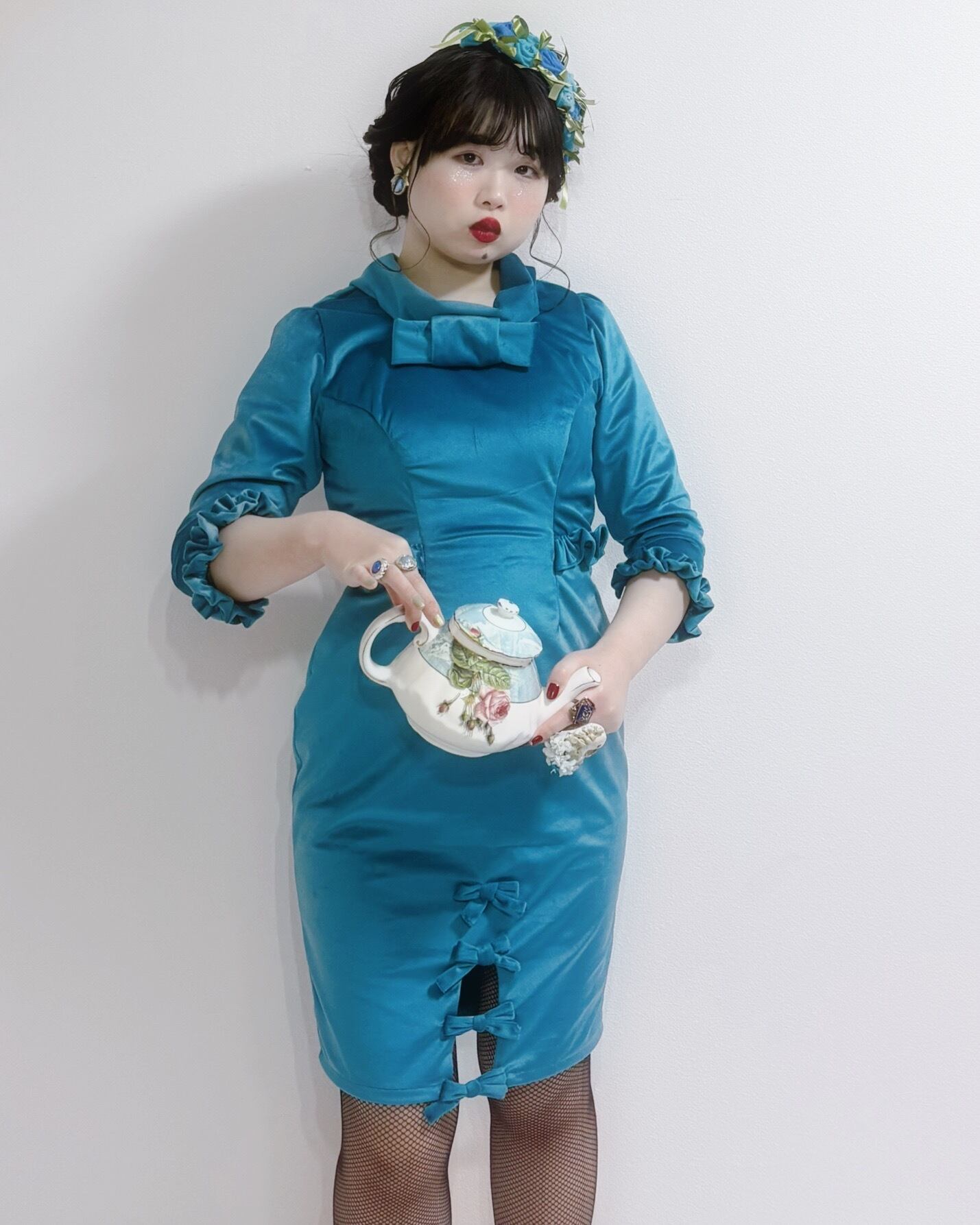 ターコイズブルーのベロアで仕立てたられた上品なタイトワンピース。